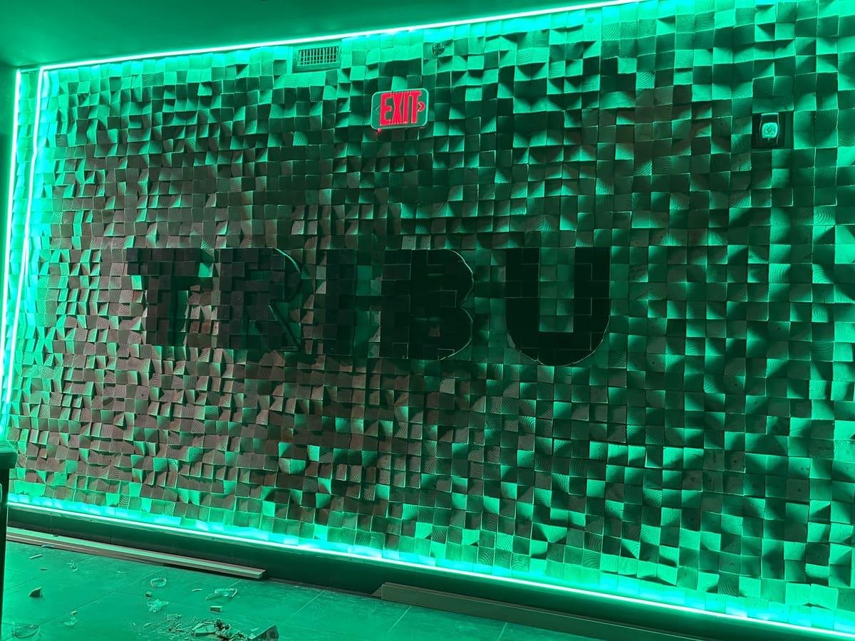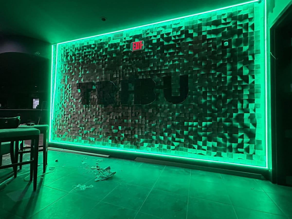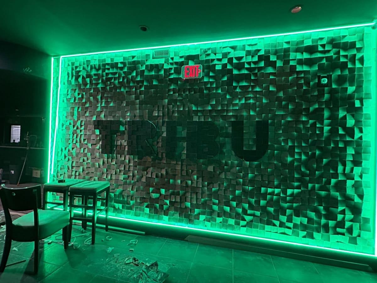En este proyecto, nos embarcamos en una propuesta única para transformar un espacio del restaurante en una obra de arte funcional. Diseñamos y construimos una pared decorativa utilizando piezas de madera cortadas en ángulo, logrando un equilibrio entre lo rústico y lo artístico. El logo del restaurante ocupa un lugar central, resaltado por una estructura moderna que lo enmarca. Para realzar aún más su impacto visual, añadimos iluminación LED en una caja perimetral, que no solo destaca los detalles angulares de la madera, sino que también aporta un toque contemporáneo al ambiente.