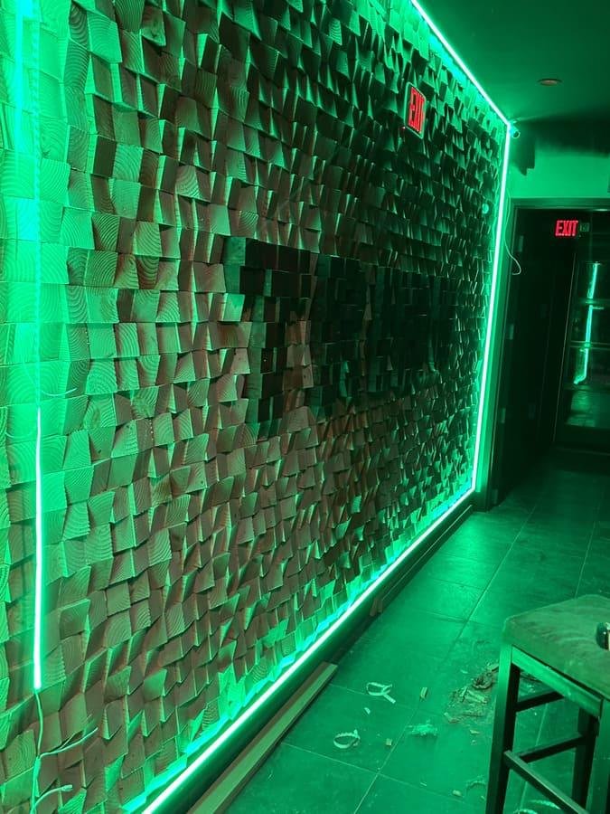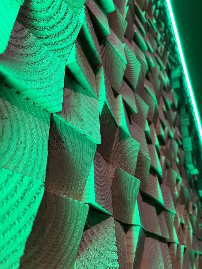 Decorative wall with angled wood and LED lights