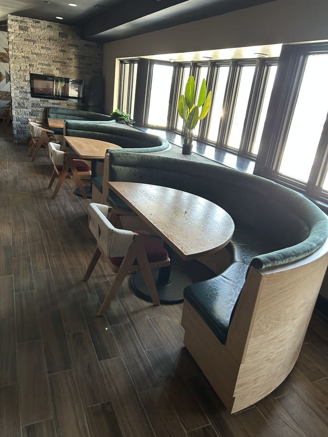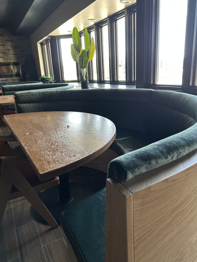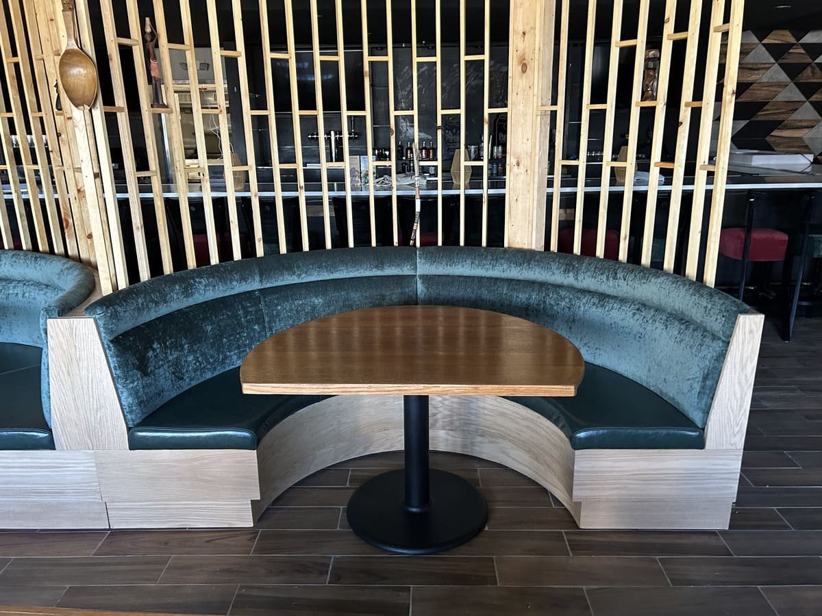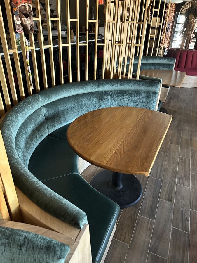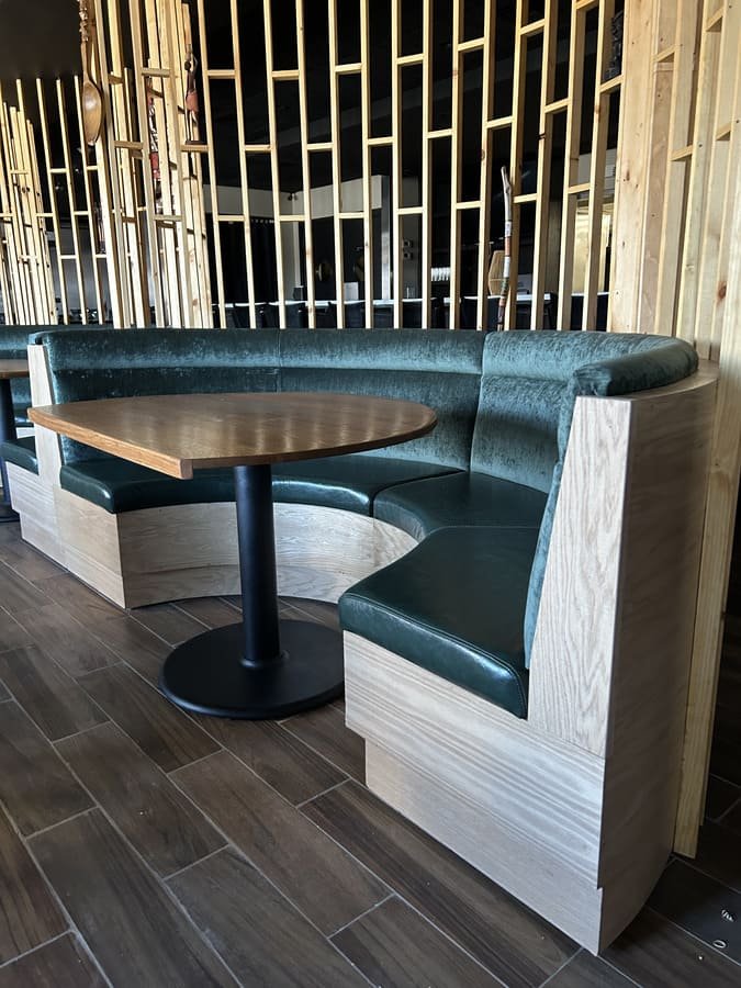 This project focused on creating unique semicircular furniture pieces that bring an air of sophistication to the restaurant. Each piece was designed to offer both comfort and style, combining carefully selected colors and materials. The backrest is upholstered in luxurious green velvet, while the seats feature durable brown vinyl that adds warmth. These furniture pieces not only complement the wooden finishes of the space but also create a cozy and elegant atmosphere, perfect for highlighting the venue’s identity.